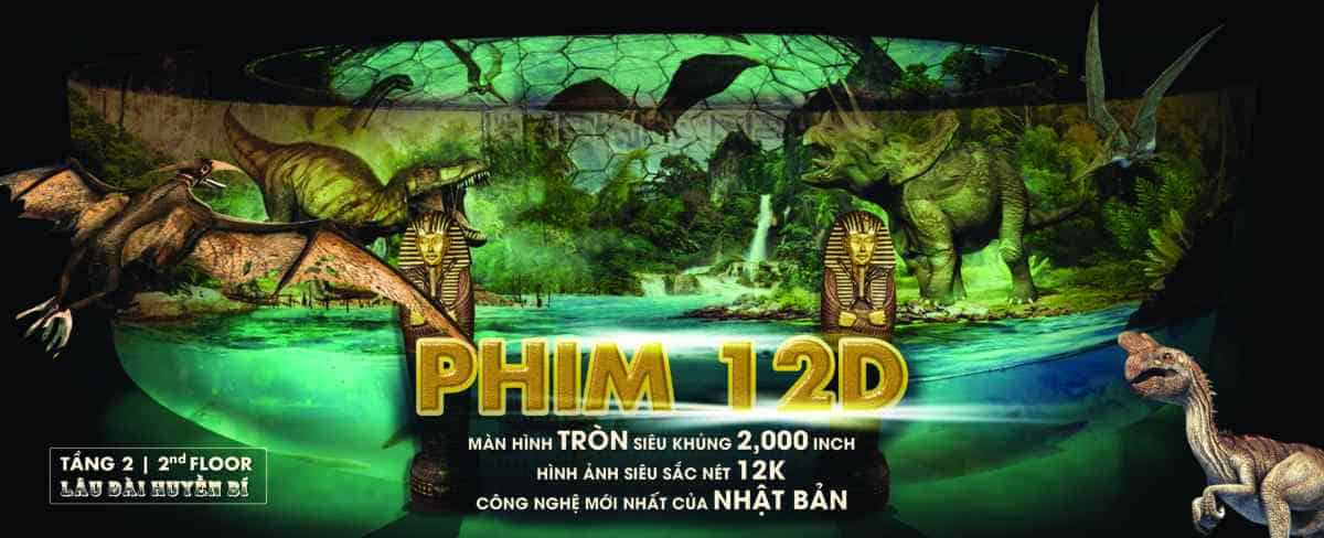 Rạp chiếu phim 12D – công nghệ hiện đại nhất của Nhật Bản mang lại cho khách hàng những trải nghiệm xem phim mới nhất tại Khu đồi huyền bí. Với màn hình tròn siêu khủng 2000 inch và hình ảnh siêu sắc nét 12K, sẽ khiến du khách không khỏi rùng mình khi theo dõi các bộ phim kinh dị hay choáng ngợp trước những khung cảnh thiên nhiên hùng vĩ được tái hiện kèm các hiệu ứng như mưa, gió, sét, tuyết, khói, bong bóng, rắn bò chân, động đất.