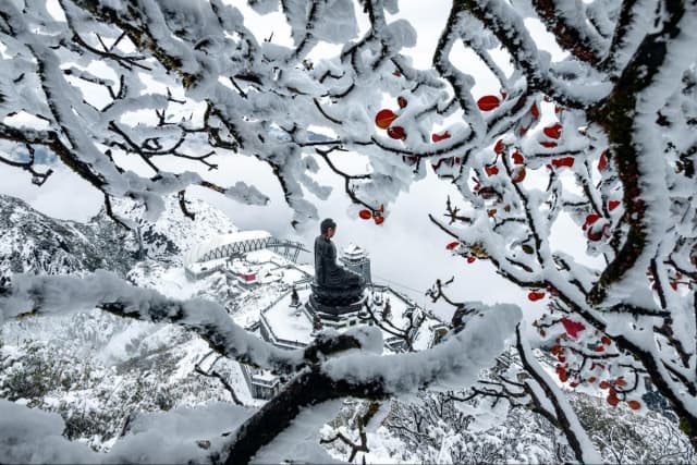 Complementing the complex is the Great Amitabha Buddha statue, one of its most remarkable highlights. Crafted from thousands of copper plates, it has been recognized by the Asia Records Organization as the highest-altitude bronze Amitabha Buddha statue in Asia.
