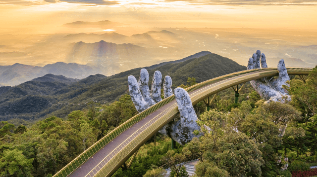 Trên đó, con người hiện đại đã xây một cây cầu Vàng, để tôn vinh thế giới xa xưa, và để họ có thể dạo bước trên đó ngắm rặng núi hùng vĩ chìm trong những đám mây. Đó là phần mở đầu câu chuyện về hai vương quốc Mặt trời và Mặt trăng trên đỉnh Bà Nà. Và bạn đã nhận ra: nó được bắt đầu với Cầu Vàng – cây cầu giờ đã trở thành một biểu tượng du lịch mới của Đà Nẵng. Đó là câu chuyện chủ đề của Sun World Ba Na Hills - nơi mà Sun Group đang không ngừng kể tiếp truyền thuyết về những người khổng lồ, về dấu tích của những vương quốc huyền ảo cổ xưa trên đỉnh núi Chúa.