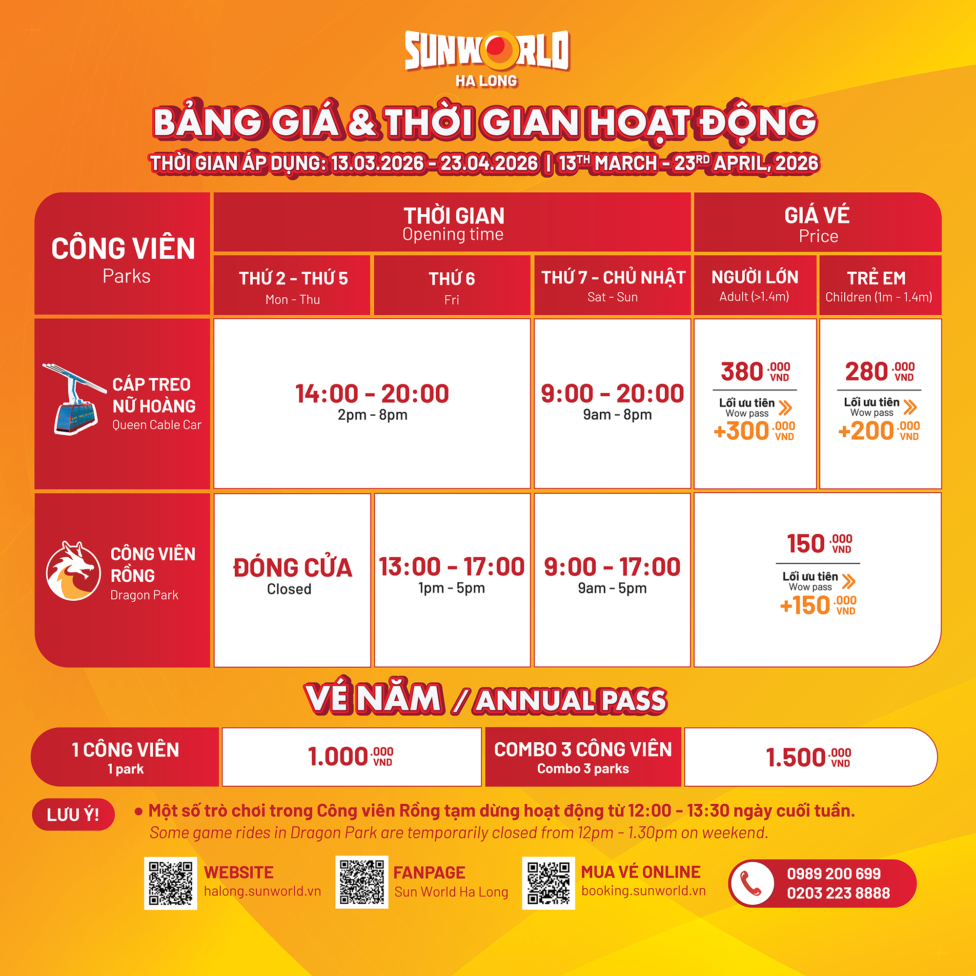 Công viên Rồng có giá vé 150.000 VNĐ, trong khi vé vào Công viên nước Typhoon sẽ mở cửa lại vào ngày 12/4/2026.