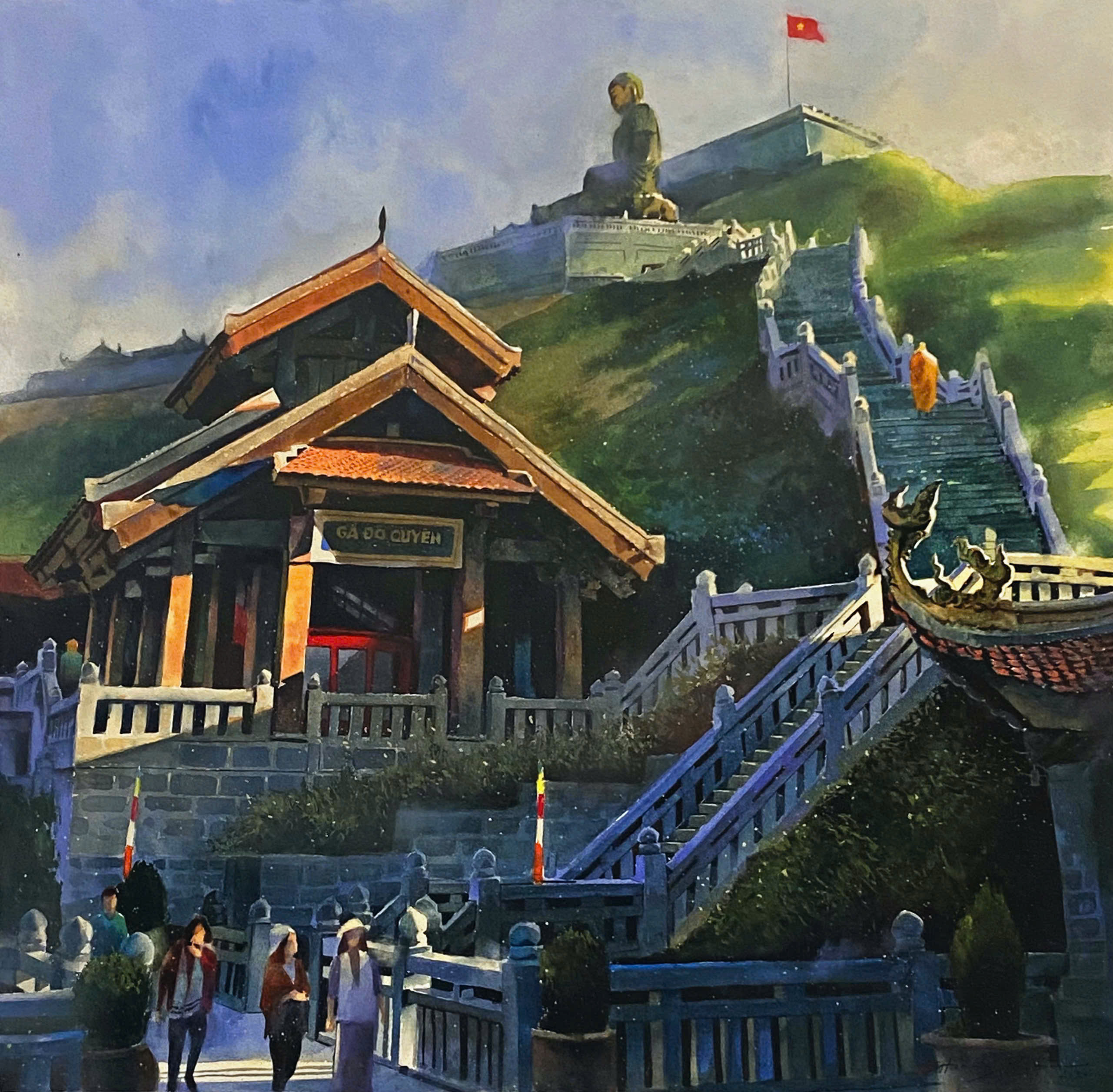 Từ ga, du khách nhìn thấy Đại Tượng Phật A Di Đà – pho tượng Phật bằng đồng cao nhất Việt Nam, được chế tác kỳ công với chiều cao 21,5m, nằm ở độ cao 3.075m so với mực nước biển. Tượng được tạo thành từ hàng vạn tấm đồng dày 5mm, tổng trọng lượng lên đến 62 tấn. Phóng tầm mắt xa hơn, có thể thấy cột cờ sừng sững tại đỉnh nóc nhà Đông Dương.