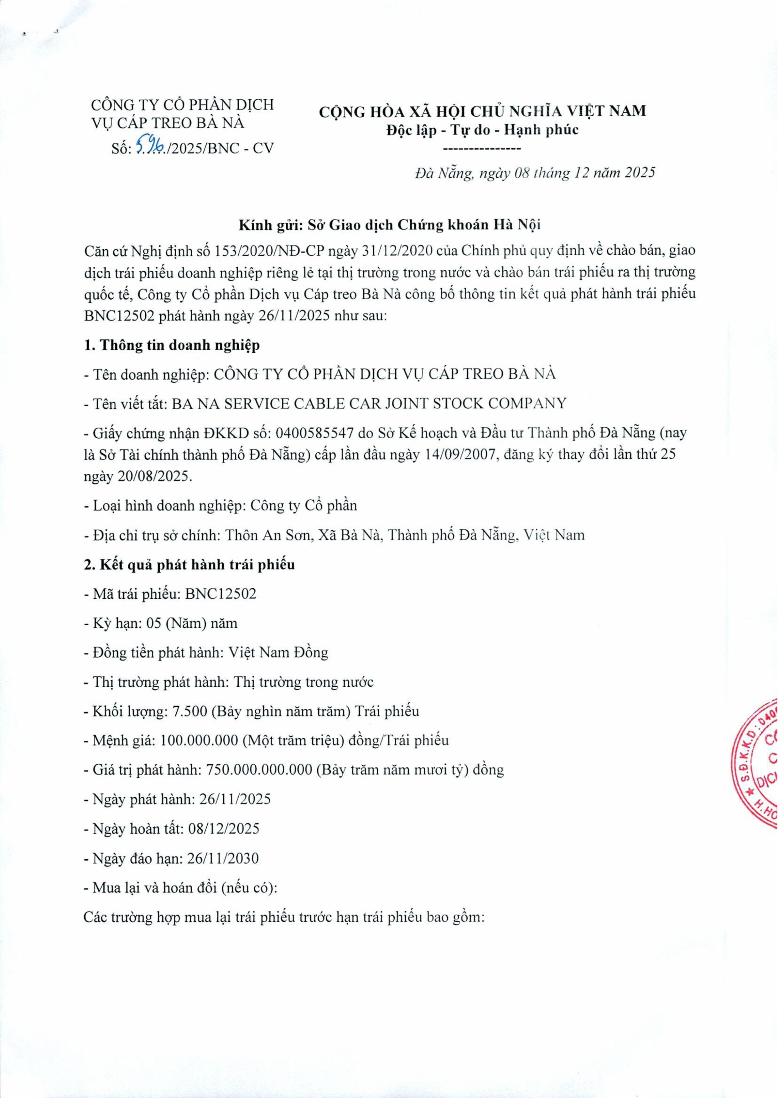 Căn cứ Nghị định số 153/2020/NĐ-CP ngày 31/12/2020 của Chính phủ quy định về chào bán, giao dịch trái phiếu doanh nghiệp riêng lẻ tại thị trường trong nước và chào bán trái phiếu ra thị trường quốc tế, Công ty Cổ phần Dịch vụ Cáp treo Bà Nà công bố thông tin kết quả phát hành trái phiếu BNC12502 phát hành ngày 26/11/2025 như sau: