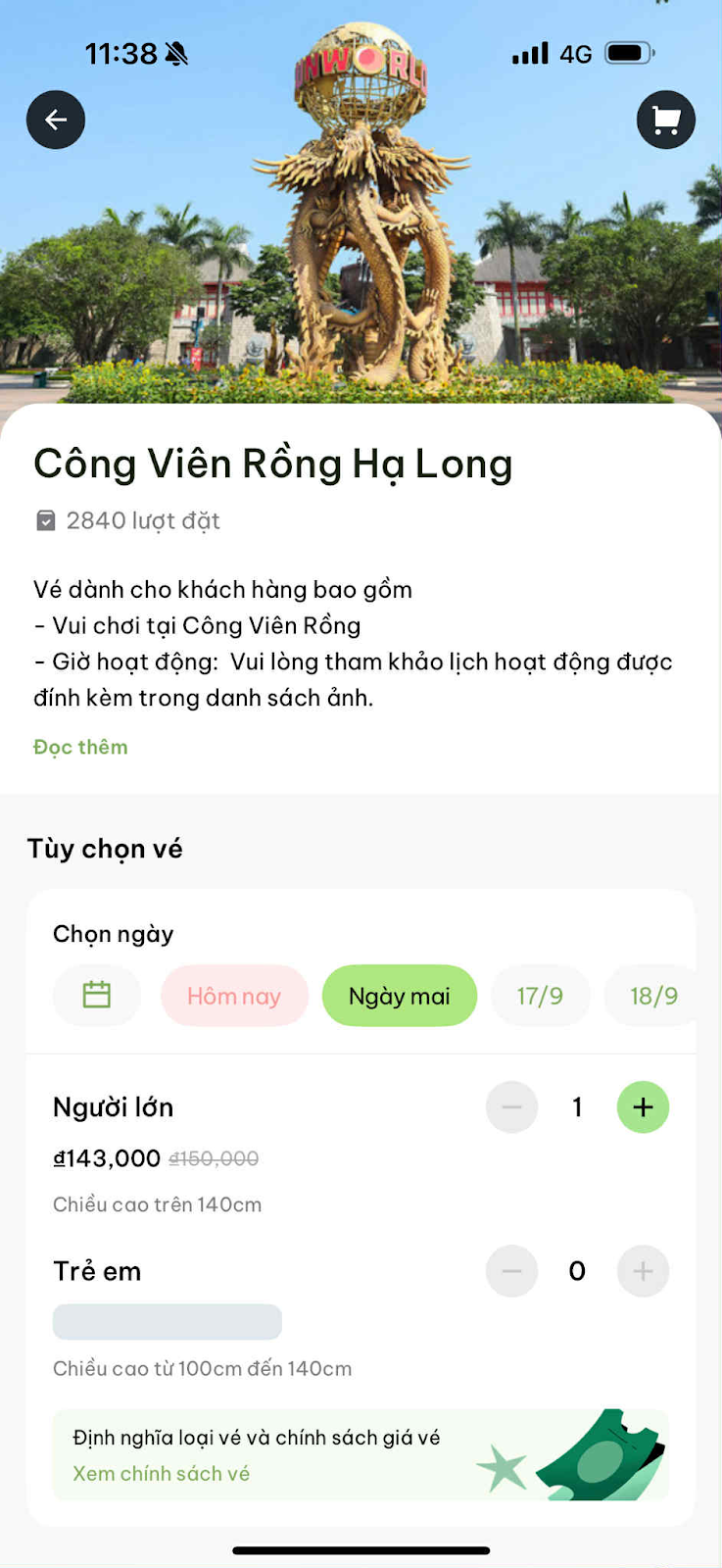 Bước 2: Chọn số lượng vé, sau đó chọn biểu tượng giỏ hàng để làm thủ tục thanh toán.
