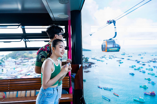 Khoang cáp rộng, cửa kính trong suốt giúp du khách dễ dàng quan sát toàn bộ khung cảnh bên dưới, từ những con thuyền đánh cá đến các bãi biển uốn cong theo bờ đảo. Đây cũng là khoảnh khắc thư giãn nhẹ nhàng trước khi bước vào các hoạt động vui chơi sôi động tại Hòn Thơm.