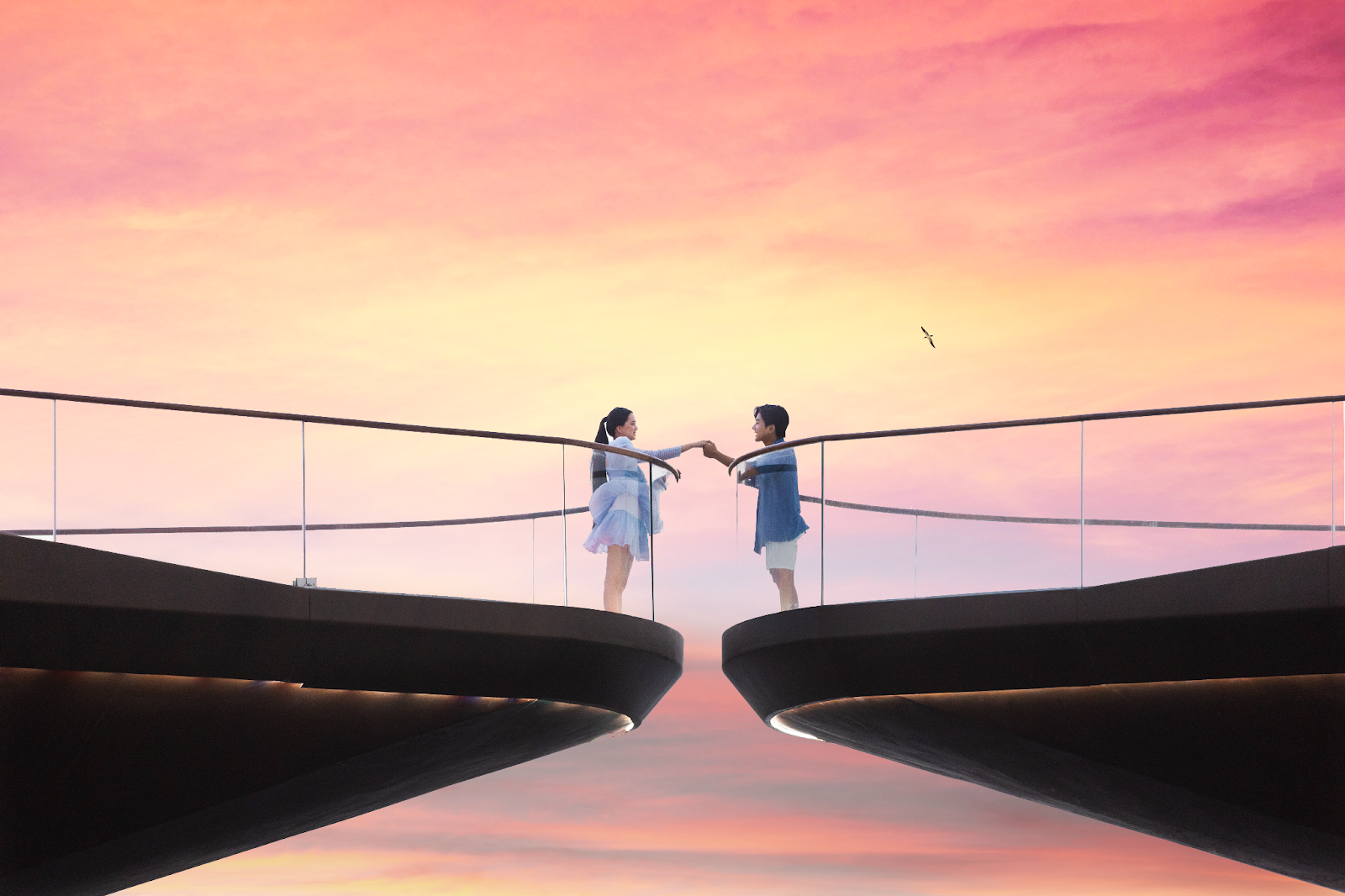 Cầu Hôn gồm hai nhánh cầu North Wing và South Wing (nhánh cầu phía Bắc và Nam), có tổng chiều dài 800m, cùng hợp thành một thể thống nhất nhưng hai mũi cầu không chạm nhau. Khoảng cách ấy vừa vặn cho một cái ôm, một cái bắt tay hay một nụ hôn đầy si mê trong ánh hoàng hôn. Vì thế Cầu Hôn còn có tên gọi thân mật là “Chạm”, tựa như lời nhắn nhủ rằng chỉ có sự khao khát kết nối của con người, mới có thể lấp đầy khoảng trống của sự chia cắt.