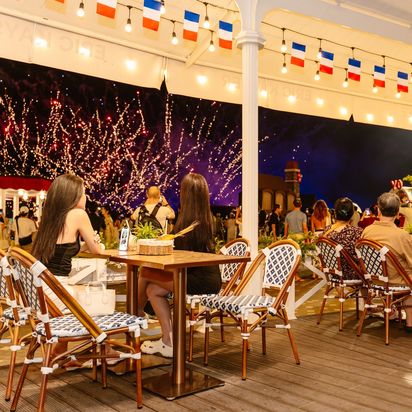 Từ trên cao, bạn còn có thể bao quát toàn cảnh quảng trường rực rỡ ánh đèn và dòng người hòa vào không khí lễ hội bên dưới. Góc nhìn này mang lại cảm giác “đứng giữa trung tâm sự kiện” nhưng vẫn đủ riêng tư để tận hưởng trọn vẹn khoảnh khắc.
