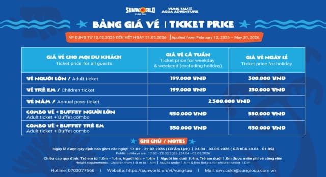 Ngày 5/2/2026, công viên thứ 9 của tập đoàn Sun Group - Sun World Vung Tau chính thức mở bán vé trên website https://booking.sunworld.vn. Với mức giá chỉ từ 199.000 đồng/người, du khách đã có thể thỏa sức trải nghiệm 100 trò chơi nước cảm giác mạnh thiết lập nhiều kỷ lục thế giới, châu lục và lần đầu tiên có mặt tại Việt Nam.